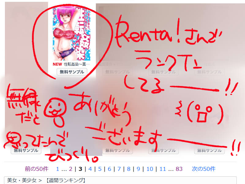 おかげさまで今まで意識したこと全くなかったんですが、今回ぶらっと覗いたらRenta!さんでランクインしてて( Д ) ゚ ゚ってなりました。デイリー?週間?の150位くらいに入りました。私のようなペーペーが…ありがたいことです。